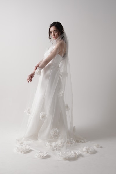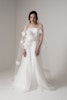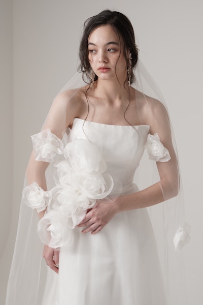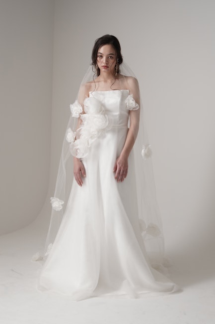 シンプルなストレートネックの身頃に 立体的に重なるオーガンジーフラワーが印 象的な一着。