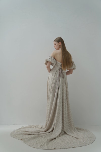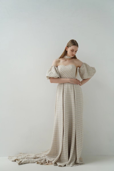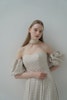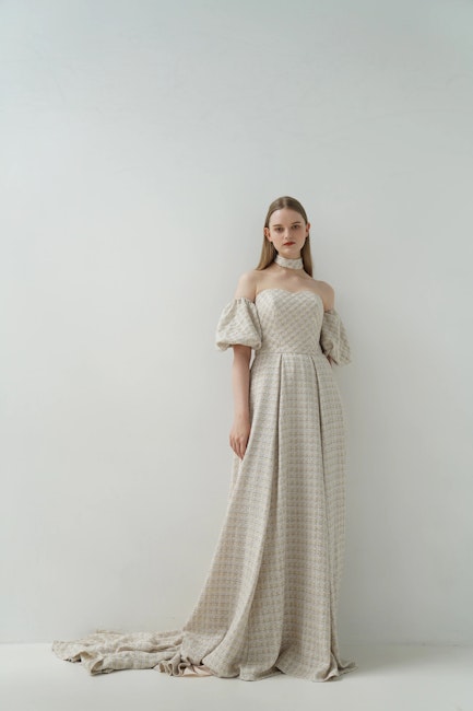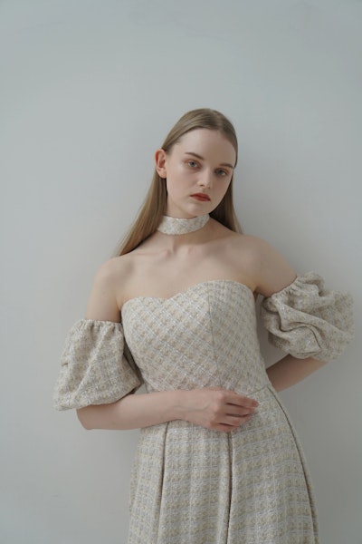 オフショルダーのデザインはデコルテを美しく見せ、立体的なスリーブとのバランスで、クラシカルかつモードな印象に。