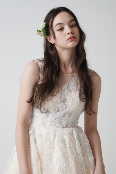自然光のもとでは透明感を、ライトの下では星のような輝きを放つ写真映えするドレスです。