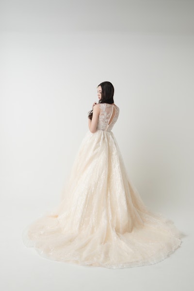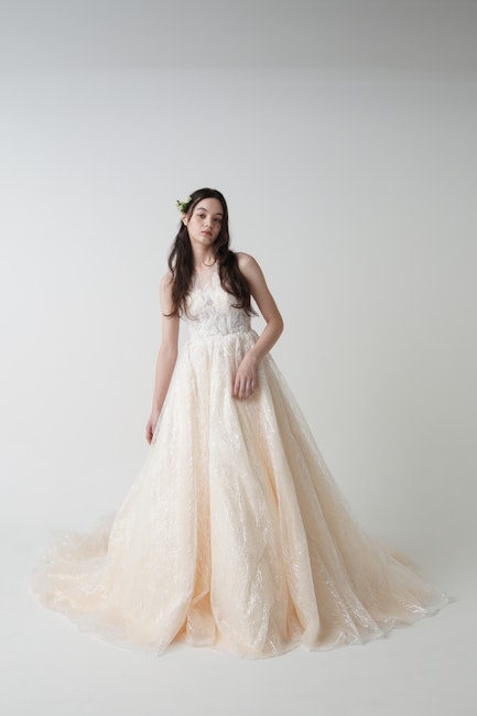 やわらかなニュアンスカラーのチュールに重なるグリッターが、動くたびに光を受け、花嫁様をやさしく包み込みます。