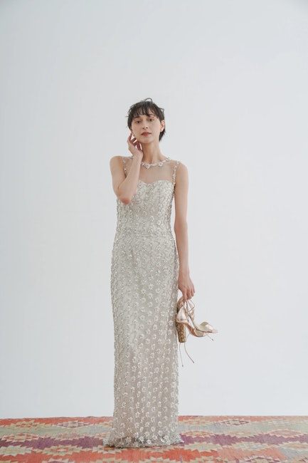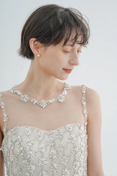 クリスタルの光が肌に溶け込むように映え、シアーなトップデザインがデコルテを美しく引き立てます。
