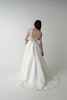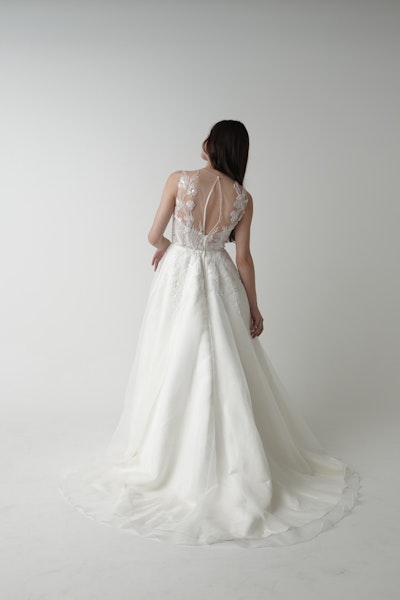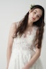 ナチュラルなボタニカル刺繍がデコルテから背中へとやさしく広がり、透明感のある女性らしさを演出します。
