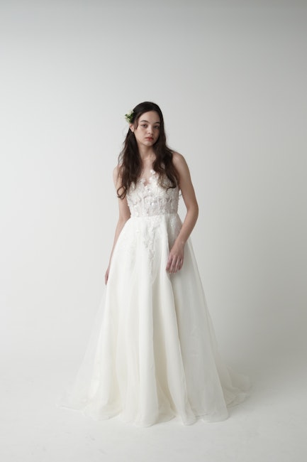 スカートは軽やかなチュールを重ね、ふんわりとした動きを生み出すAラインシルエット。