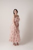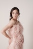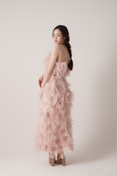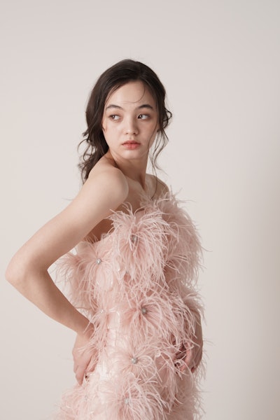 エアリーなボリュームと計算されたシルエットが魅せる、軽やかでモードな存在感。オーストリッチのフェザーを贅沢に使用し、動くたびに揺れ、自然体の中に華やかさを感じさせます。洗練された花嫁にふさわしい、ファッションピースのようなドレス。