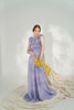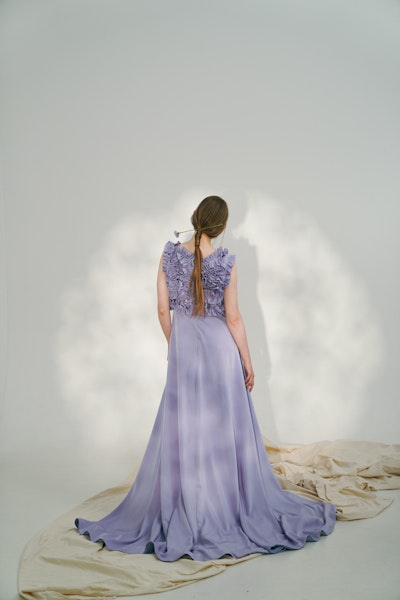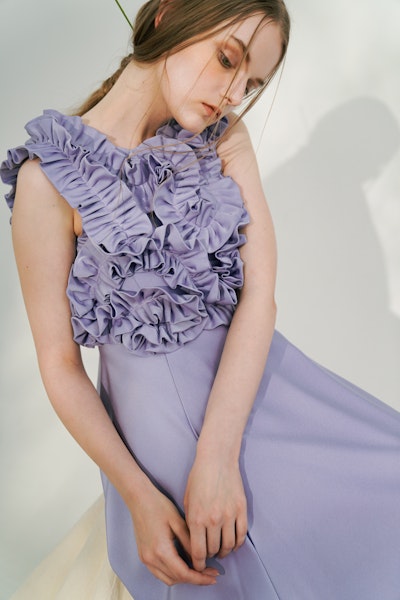 "小さな妖精"をイメージに作られたドレス。くしゅっとランダムに施されたフリルは、ボリュームがあり顔周りをぱっと華やかに見せてくれます。パステル調のパープルカラーが、女性らしいやわらかさを演出する一着です。